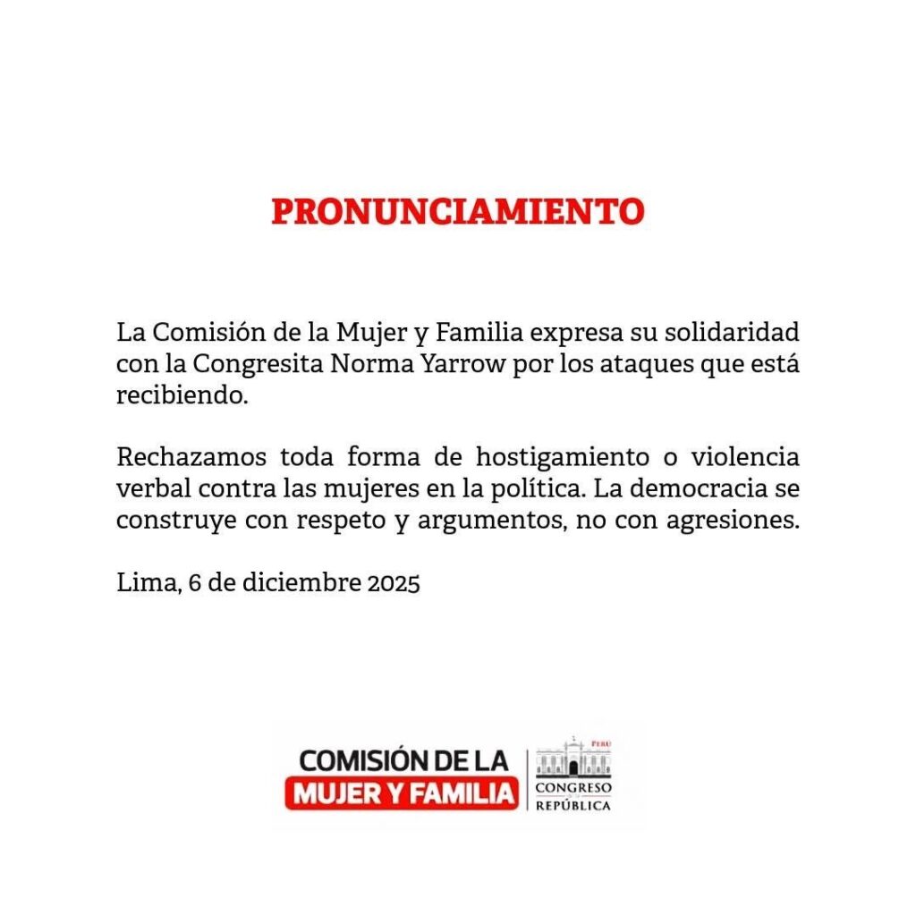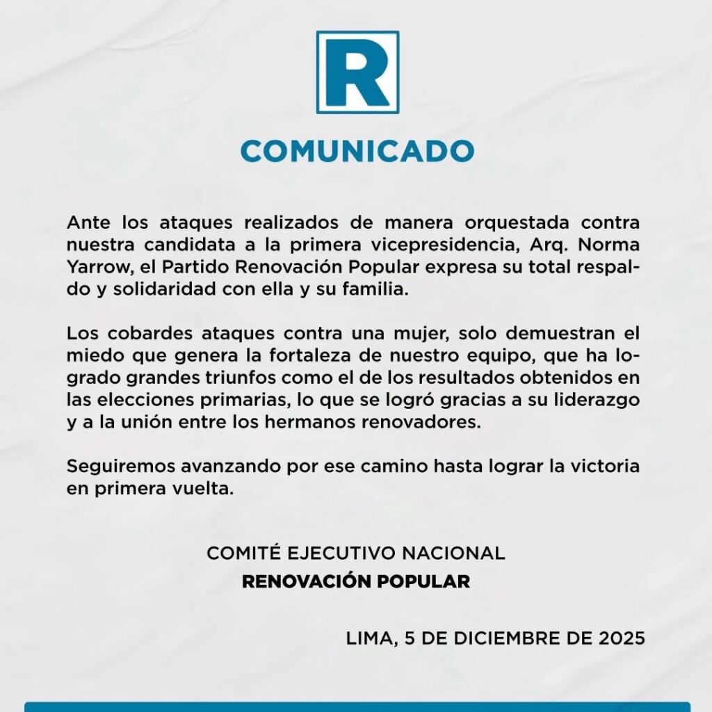 El Comité Ejecutivo Nacional de Renovación Popular y la Comisión de la Mujer y Familia del Congreso de la República condenaron públicamente los hechos, señalando que constituyen violencia política de género, un mecanismo que busca silenciar a mujeres que ocupan espacios de liderazgo.